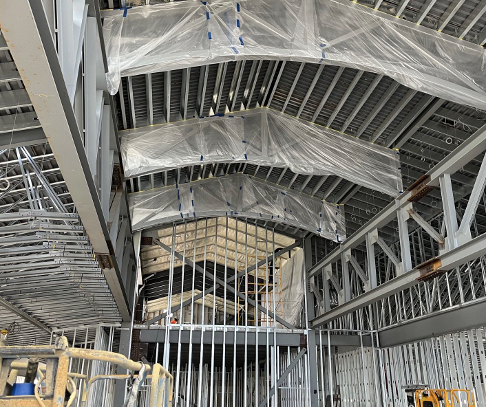 At this point in the process, the building’s interior is coming together, but still skeletal. Still, HCS covered up the structural beams before spraying. Later, these beams will be covered in wood veneer for a polished, classic look.