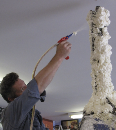 Steve then applied VersiFoam, a closed-cell spray foam insulation kit which arrived with a U-Control dispensing gun attached to two 10-foot hoses, ten mixing nozzles, three fan tips, and nitrile gloves. Once Steve had foamed the entire chicken wire, he sculpted the foam to create a banana shape. He then laid fiberglass, with a resin, over the top of the foam, as he knew the foam would not get eaten away by the fiberglass.