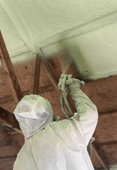 The crew sprayed just over 2,000 square feet of Huntsman HEATLOK HFO High Lift closed-cell foam to the walls, roof, and decking. The crew for the first barn project included Danny as the lead sprayer and Colton assisting with scraping and cleaning. Using their new rig, which Danny had won for winning Spray Foam Magazine’s Contractor of the Year, they put on their full PPE and used a PMC PH-2 and a Carlisle ST1 gun to spray one and a half inches of foam over one and a half inches of foam board installed by the team at the rescue in both the walls and ceiling. The foam application went smoothly, and the project was straightforward.