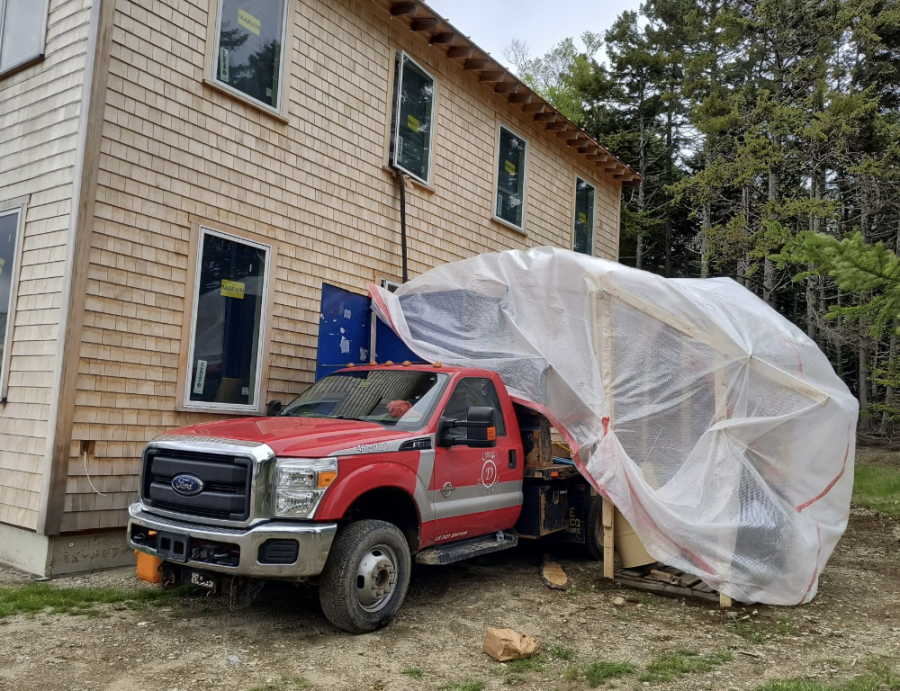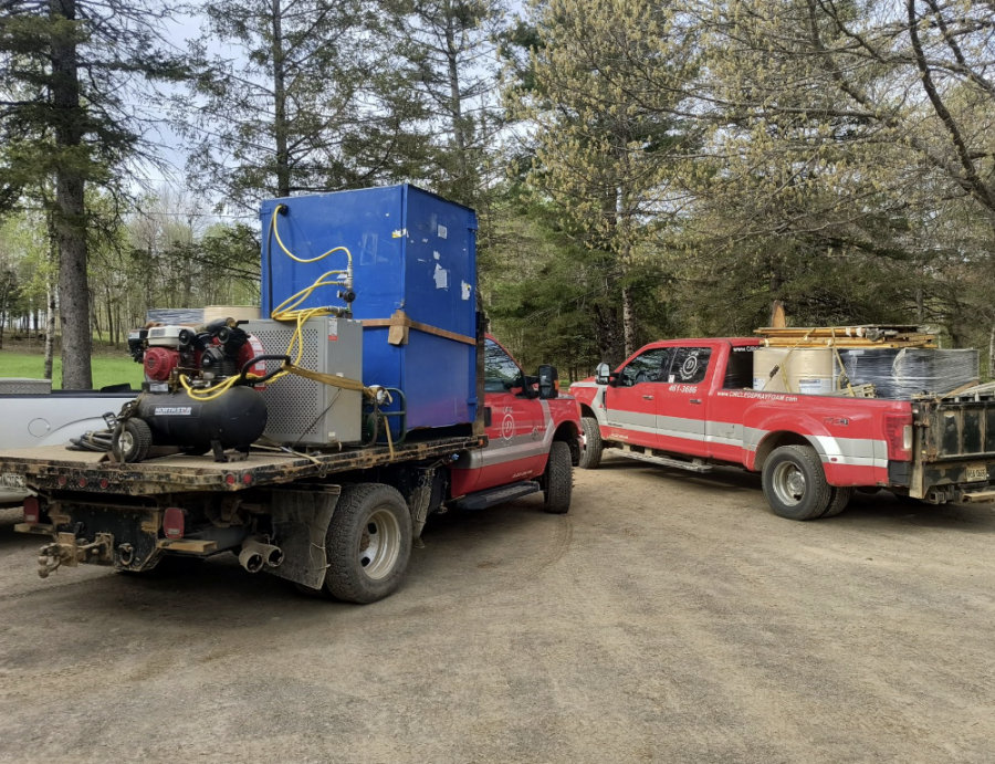 Like many in the spray foam industry, Doodson is a natural problem solver. Even so, most jobs don’t require you to build a rig from scratch, pack as light as possible, and haul your tools across a body of water– but spray foam jobs aren’t most jobs. Doodson wasn’t about to let a little water and logistics stop him. In May, he and his lead sprayer Trenton Astbury completed a project on Maine’s scenic 700 Acre Island, reaching the site via three different vehicles and constructing a makeshift foam rig inside a tent built on the back of a truck. That setup allowed them to spray Enverge closed-cell foam on two separate buildings during their weeklong stay. As far as Doodson is concerned, it was one of the more interesting jobs he’s had the pleasure to coordinate.