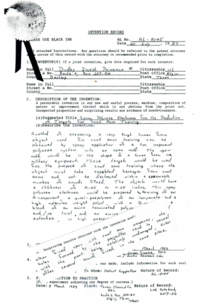 Back in 1987, a year after the polyurea spray elastomer technology was developed and demonstrated, an Invention Record was filed on the use of polyurea spray to prepare small arms targets for training purposes. When applied at 125 to 250 mils (~3 – 6 mm) in thickness, the projectiles did pass through, but the holes formed tended to reseal, thus allowing for multiple use. This was found to be true even for the small .22 caliber projectile. So figuratively, the polyurea coating may have been bulletproof, but literally it was NOT! Ah yes, the marketing “play on words” here.